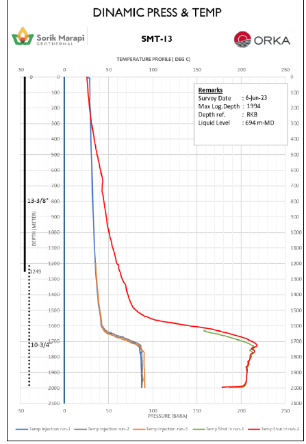 2023年6月7日,SMGP鉆井和資源團(tuán)隊(duì)對耗時27天、于6月6日完井的T-13井進(jìn)行了完井測試。測試數(shù)據(jù)顯示:T-13是一口高溫、高流動性的生產(chǎn)井,成功打出了因T-11修井失敗而損失的熱源。該井吸水指數(shù)在54.76kg/s/bar到94.12kg/s/bar之間,在停止注水后4.5小時后井下最高溫度即錄得217.9℃。其生產(chǎn)層穩(wěn)定在300℃的情況下,該井預(yù)計(jì)可生產(chǎn)190噸/小時的高壓蒸汽。